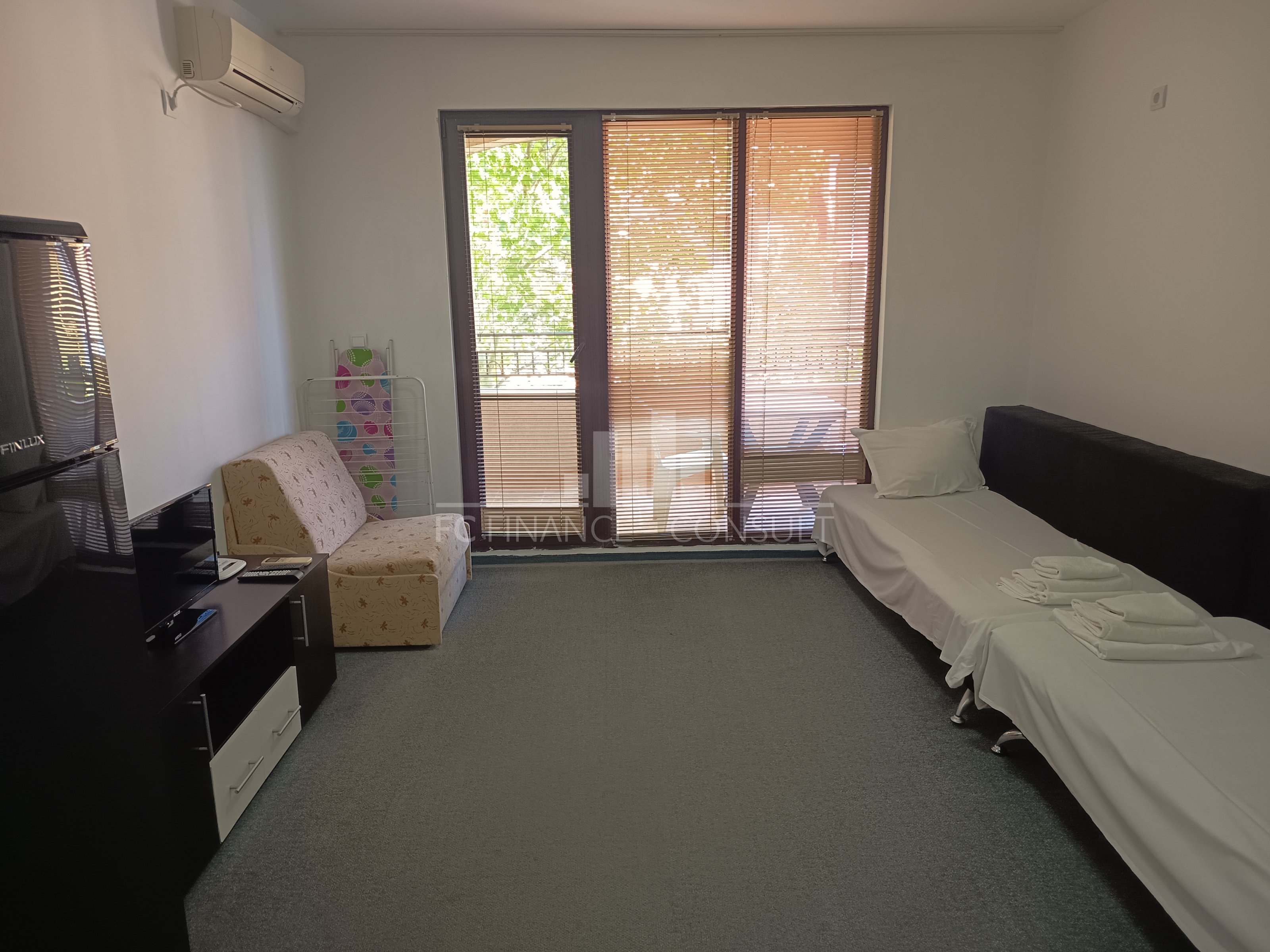 The garden view studio apartment with a a floor area of 48 m2 is situated in a private fully equipped holiday complex on the 4th floor of a five-storey house in a beautiful and quiet location Aheloy in the Gulf of Burgas, near the healing mud of Pomeranian salt flats. This resort is not very famous, it stays away from the crowds of tourists and offers a peaceful holiday by the Black Sea. The resort is a 15-minute drive from Burgas Airport and is located directly on one of the beaches, which also has a small marina with yachts and fishing boats. The holiday complex is built on 40,000 m2 area and consists of 4 individual areas / parts. Marina, Cove, Tower and Lighthouse form the original concept of each of its 750 apartments. In the whole area you can use 4 restaurants, many cafes and bars, 2 swimming pools with water bars, spa, sports center, squash courts, wellness and SPA center, massages, general practitioner s office, supermarket and several others smaller shops with a diverse offer of various goods. High-speed internet and cable TV are also available in each apartment. The property is suitable for your own rest and recreation and also as an investment for rent. It is a unique possibility of summer living in a beautiful and pleasant environment.